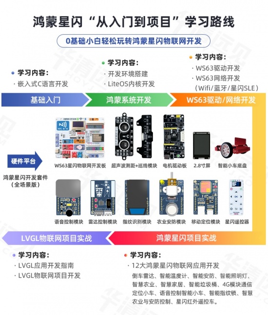 华清远见WS63星闪物联网开发板提供“从入门到项目”的全体系学习路线,助力0基础小白轻松玩转鸿蒙星闪物联网开发。